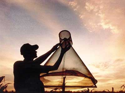 Hartstack traps baited with pheromones have been used to monitor populations of Helicoverpa zea (Boddie) and Heliothis virescens (F.) throughout the mid-South. In the Mississippi Delta, populations of both species have fluctuated annually over the last 20 years, but populations of both species have declined since 1997. (Photo courtesy of USDA-ARS)