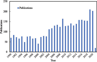 Number of published papers in cotton research from WoS agronomy category during 1990 to 2021.