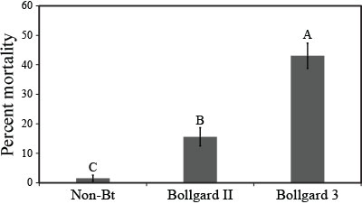 Bollworm mortality on non-Bt, Bollgard II, and Bollgard 3 cotton flowers. Percent mortality ± SEM 3 d after infestation. Stoneville, MS, 2018 and 2019. Means separation was conducted with transformed (log10) data. Means and standard errors (%) presented are not transformed. Columns containing the same letter are not significantly different (Tukey-Kramer HSD test, α = 0.05).