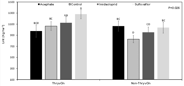Effect of insecticide performance and cotton technology for tarnished plant bug management on cotton lint yield. Bars with a common letter are not significantly different (FPLSD, p = 0.05)