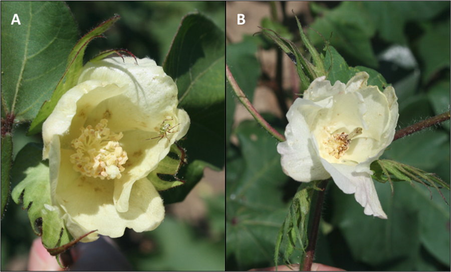 Dirty flowers associated with tarnished plant bug (TPB) damage: A. Normal shaped bract flower with a TPB nymph and less than 50% damaged anthers; B. Frego-bract flower with more than 50% damaged anthers.