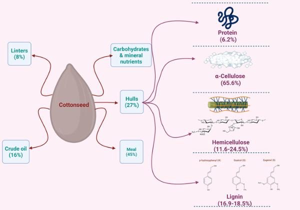 Components of cottonseed, which include linters (8%), crude oil (16%), meal (45%), and hulls (27%). Hulls, a major lignocellulosic biomass in cottonseed, comprise protein (6.2%), α-cellulose (65.6%), hemicellulose (11.6-24.5%), and lignin (16.9-18.5%) (numerical values are taken from Dukare et al., 2023; Li et al., 2001).