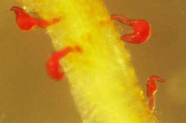 Reniform nematodes, which have been stained red, feeding on cotton roots (Robinson et al.).